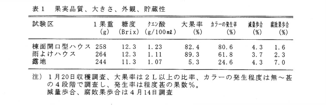 屋根面フィルムは11月上旬頃から6月下旬頃まで、側壁面フィルムは12月上旬頃から5月下旬頃まで被覆する。その他の期間はフィルムを巻き取りして、露地状態にして栽培した不知火の果実の大きさや成熟期は雨よけハウスとほぼ同じだが、カラーの発生が良好である(