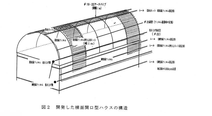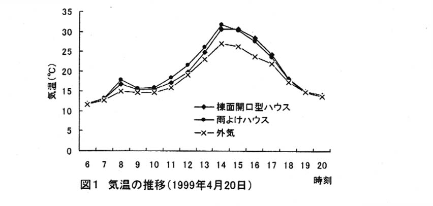 このハウスは棟部が幅1mにわたり開口しており、対流による自然換気が行われ、晴天時における日中のハウス内気温は雨よけハウスに比べやや高く推移するが、高温による果実や葉への影響は無く、フィルムの開閉など換気作業の必要がない(
