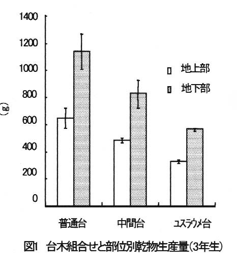 「千曲白鳳」を中間台とすると、「川中島白桃」3年性の乾物生産量は地上部、地下部ともに普通台ユスラウメ台の中間である(