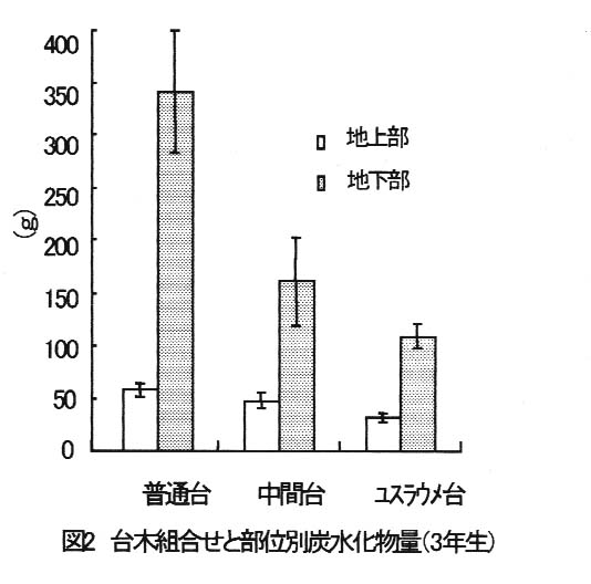 総炭水化物量は地上部でほとんど差はないが、地下部では普通台が明らかに多い。中間台は普通台とユスラウメ台の中間である(