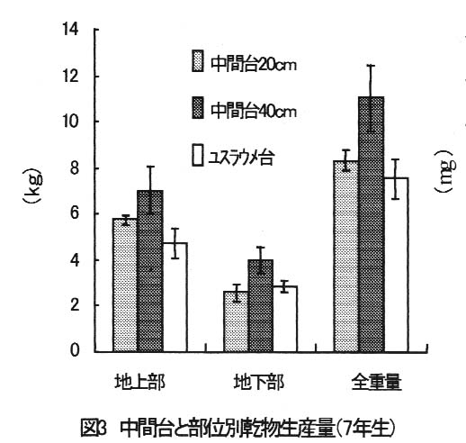 中間台木の長さの比較では、7年生樹において20㎝よりも40㎝の方が乾物生産量が優れる(