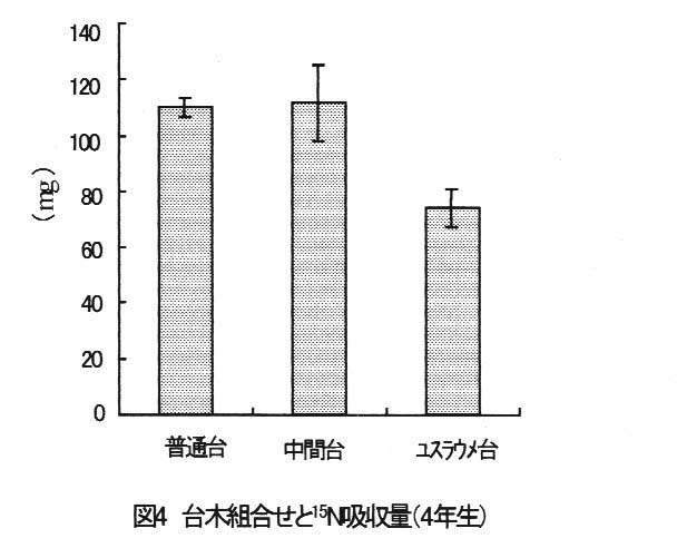 標識Nの冬から収穫時までの総吸収量(4年生)は中間台の方がユスラウメ台より多く、普通台と同程度である。(