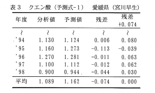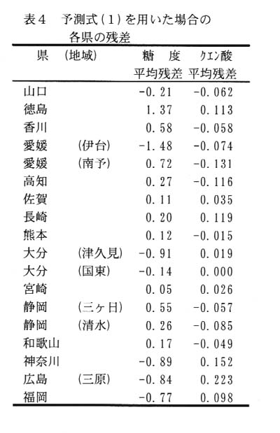 この予測式を使って、過去の分析データとの差(残差)をみると、各地域により特徴ある傾向がみられ、残差をもとに定数項を補正することで地域毎に精度の高い(糖度で±0.5、クエン酸で±0.1程度)予測式を作ることができる(