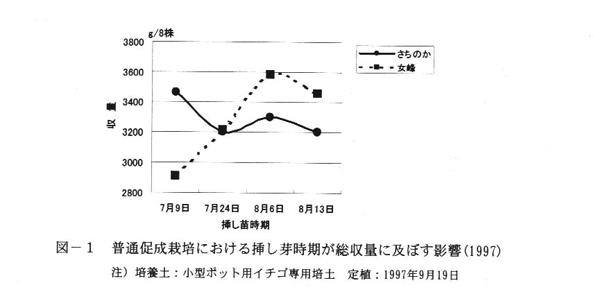 ‘さちのか’の小型成型苗は、早期から収量を高めるために‘女峰’以上に挿し苗後の育苗日数を確保する必要がある。そのため、普通促成、夜冷促成栽培の両作型ともに育苗期間は70日前後が適している(