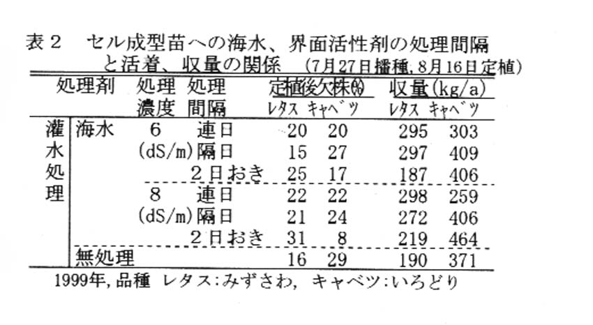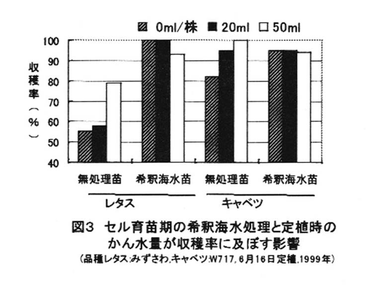 レタスでは、海水(または食塩)をEC6dS/mに希釈し、春まきは1.5葉期、夏秋まきは2.0葉期から最低隔日灌水処理すると水苗の草丈伸長、葉の巻き込みを抑制でき、定植時の灌を株当たり20ミリリットル以下に減らすことができる(