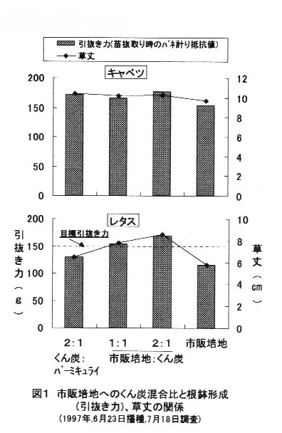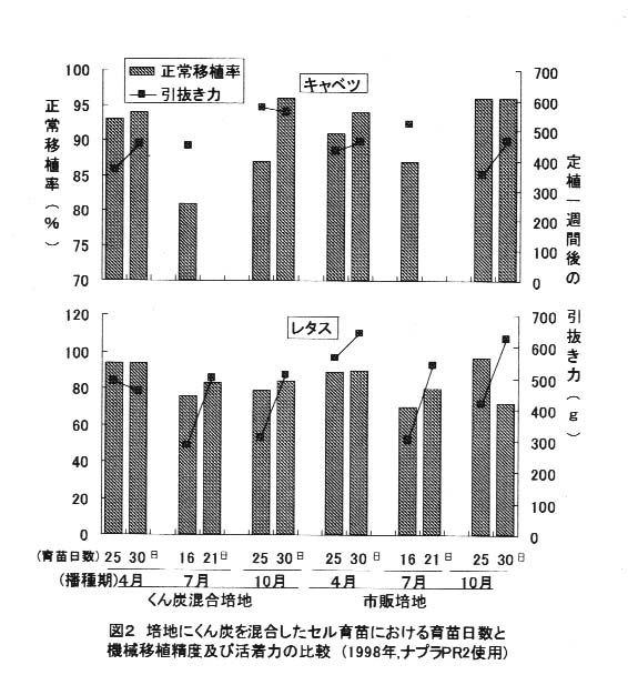 くん炭混合培地によるレタス苗は、春まきで25日、夏まきで20日、秋まきでは30日が機械移植の適期である。キャベツ苗はいずれの時期も25日以上が適期である