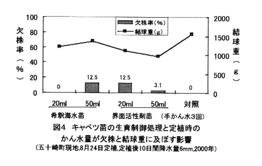 キャベツでは海水を6~8dS/mに希釈し、1.5葉期から最低2日おきに灌水処理すると草丈抑制と定植時の灌水量を減らすことができる(