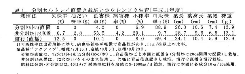 夏秋どりのホウレンソウ直置き栽培は、発芽不良や立枯病が問題となり、生産が不安定となる。その対策として、一部で移植栽培が行われているが、多くの労力を要し、生育も直播き栽培より劣る。