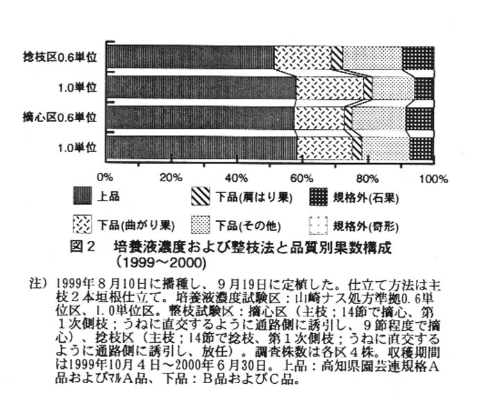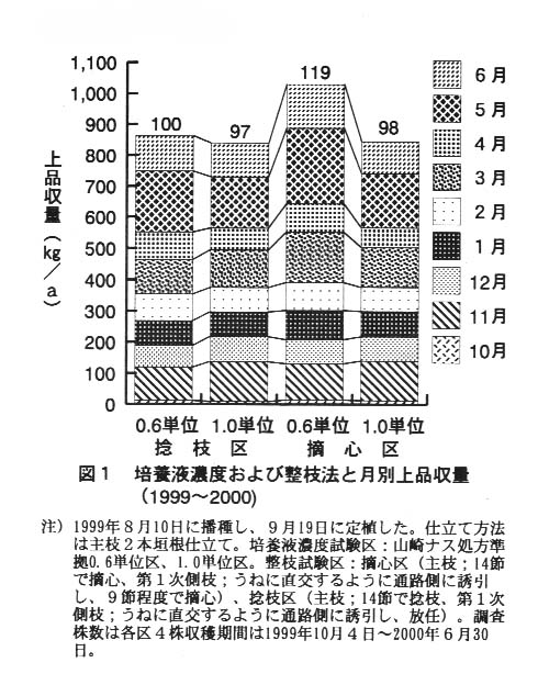 では育苗期には山崎ナス処方準拠の0.4単位、本圃では0.6単位の培養液を用い、摘心栽培することで、土耕に比べて著しく
