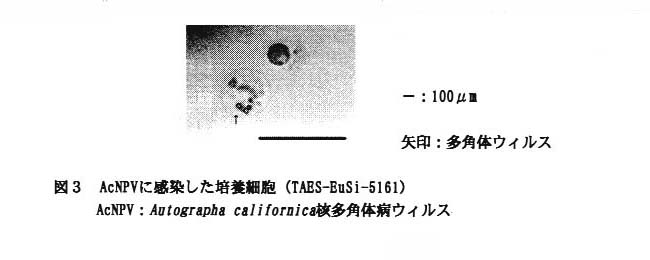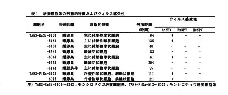 (キンウワバの一種)核多角体病ウィルス(AcNPV)を用いて樹立細胞系のウィルス感受性を調べた結果、AcNPVに対してモンシロドクガの3細胞系およびモンシロチョウの細胞系が感受性である(