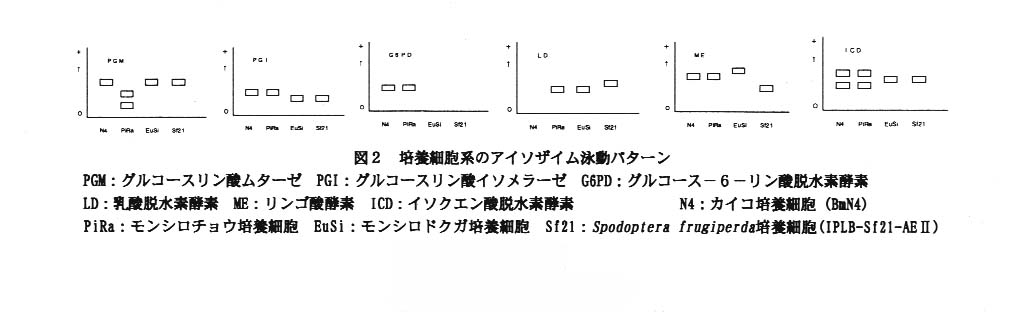 ME、G6PD、LD、PGM、PGI、ICDの6種のアイソザイム泳動パターンを調べた結果、同一種の株間に相違はないが、他種株間では明らかな相違がみられる(