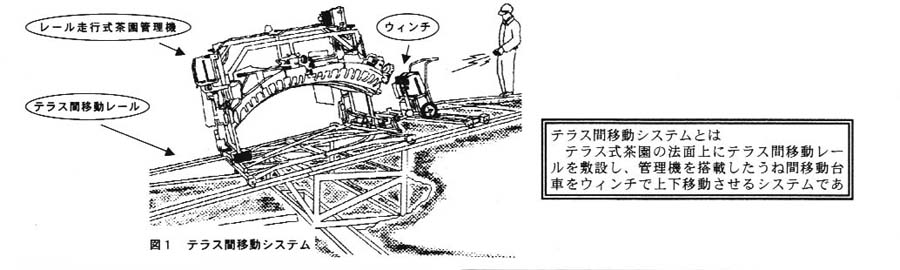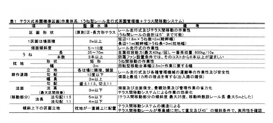 - テラス式茶園の標準区画(表1)は、レール走行式茶園管理機の作業性からみて、①区画形状は、原則として正・長方形テラスとし、1区画ほ場面積3a以上、うね長は35~70m、畑面傾斜度は5~10度とする。②耕作道路は、勾配12度以下、幅員は3m以上とする。また、畑面と最低1ケ所の接点を有し、各ほ場に隣接する。③テラス間移動システム(図1)の係る法面は、法高(最大区間段差)を3m」以下、法勾配1:1.5(盛り土法面)では法長5m以下、法勾配1:1(切土法面)では法長4m以下とする。本標準区画による茶園整備により、レ-ル走行式茶園管理機及びテラス間移動システムが導入できる。