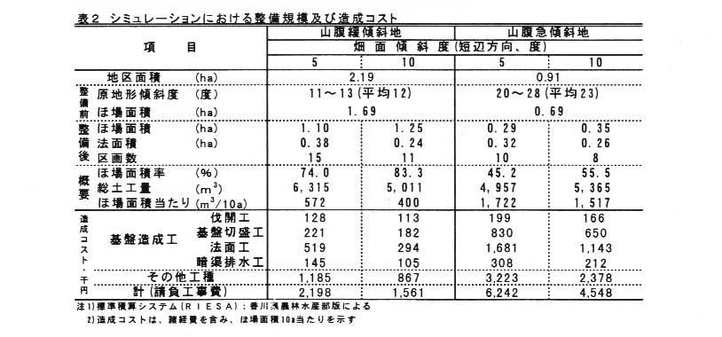 - シミュレーションに使用したソフトは、MapEntry2(農工研)、傾斜地におけるほ場整備計画支援システム(JIID)である。