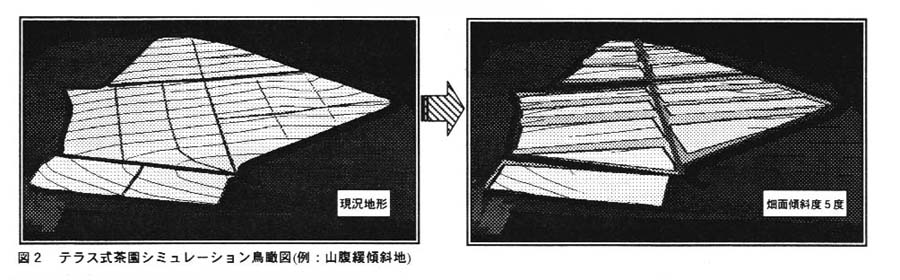 - 県内茶園の代表的な現況地形である山腹緩傾斜地と同急傾斜地を本整備法によりシミュレーションした結果(図2)、山腹緩傾斜地は同急傾斜地より、ほ場面積あたりの土工量が少なく、ほ場面積率が確保され、適応性が高い(表2)。