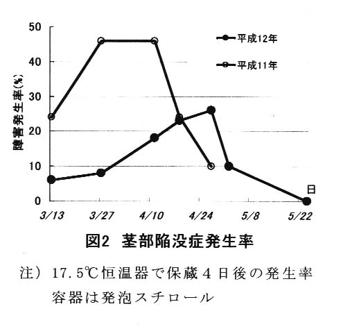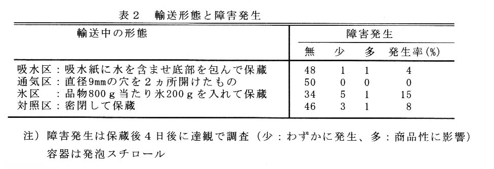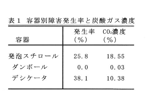 障害は春に発泡スチロール容器で輸送されたものに発生し、ダンボール容器では発生しない。障害発生時の容器内炭酸ガス濃度は9~18%である(