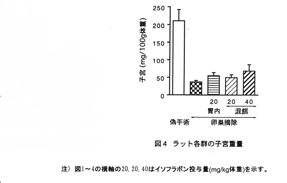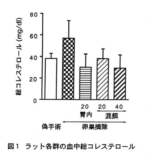 投与方法は一日一回20mg/kg体重をゾンデを用いて。直接胃内に投与する方法と餌に混ぜて(20,40mg/kg体重)自由摂取する方法とを用いた。卵巣を摘除したラットでは血中コレステロールが偽手術群に比べ有意に増加する。卵巣摘除ラットにイソフラボンを胃内投与した群においては血中コレステロールが偽手術群以下にまで有意に低下する。同量を混餌した群においては同様な低下傾向を示す。混餌投与でもイソフラボンを40mg/kg体重に増加した群では有意に低下する(
