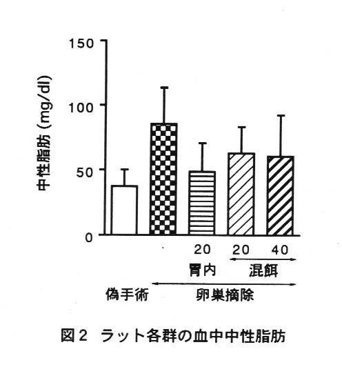 卵巣摘除群では血中中性脂肪も偽手術群より有意に増加する。イソフラボンを投与するとすべての群において血中中性脂肪が低下し、その中でも胃内投与群がもっとも低下する傾向を示す(