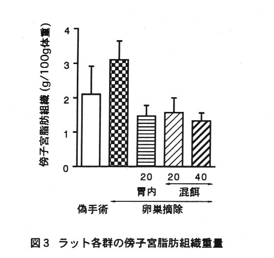 相対的な脂肪組織重量は卵巣摘除群で有意に増加する。同量投与の比較では胃内投与群でわずかであるがより低下する(図3)。