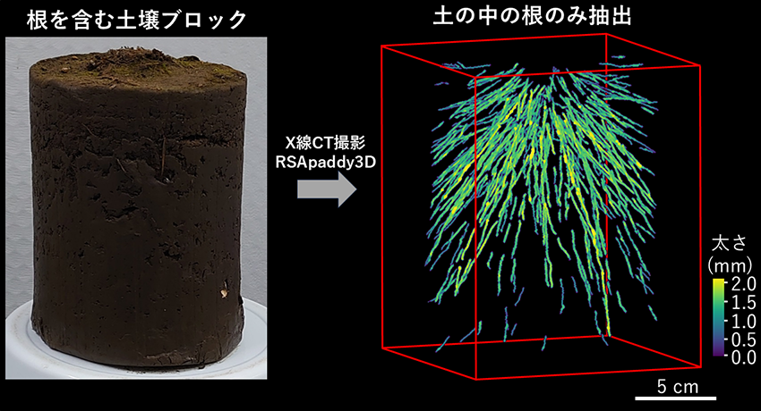 水田土中のイネの根を詳しく調べるには、水田から根を採取・洗浄後、計測する必要がありました。これら一連の作業には1個体あたり丸一日かかるなど、大きな手間と時間がかかります。そこで、X線CT(コンピューター断層撮影)を用いて、根を土から洗い出さずに可視化・計測できる技術(RSApaddy3D)を開発しました。この手法を使えば、1個体あたりわずか10分程度で根の太さや角度、広がりなどを定量することができます。