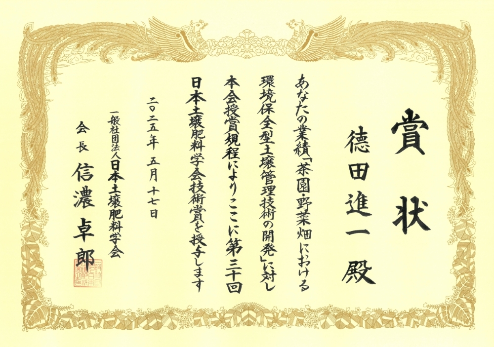 得られた知見は行政においても広く活用され、みどりの食料システム戦略等の施策への貢献も期待されるとして、日本土壌肥料学会技術賞の受賞にいたりました。