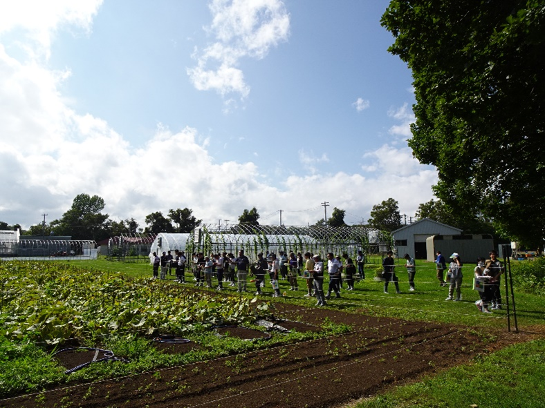 北農研圃場の見学では、遺伝資源を栽培している圃場および栽培試験を実施している圃場の見学を行い、栽培試験については鮫島上級研究員より説明を行いました。参加者からは遺伝資源と西洋カボチャの交配は可能か、施肥は面積あたりでそろえているのか、一株あたりでそろえているのか、等の質問がありました。