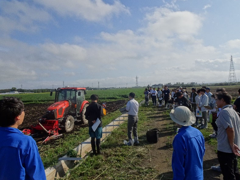 (株)はまだファームでの圃場見学では、濱田代表取締役より短節間性品種の特徴の説明や茎葉処理機について説明いただき、短節間性品種「ジェジェJ」「栗のめぐみ1号」等の栽培の様子を実際に現場で見学しながら、施肥や防除の方法について濱田代表取締役と参加者の間で活発な意見交換が行われました。