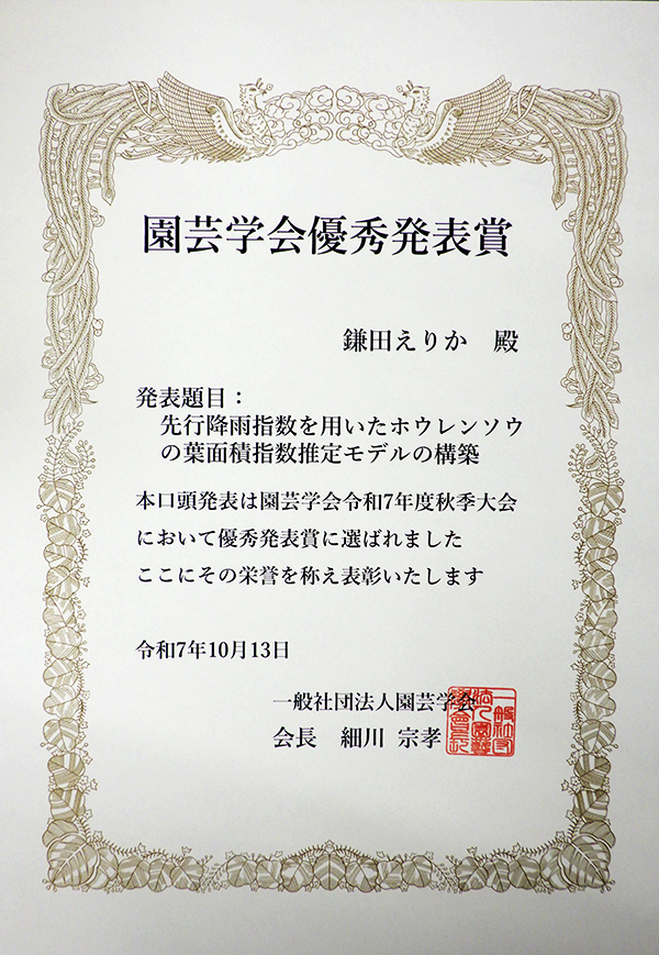 園芸学会 令和7年度秋季大会において、乾燥や湿害によるホウレンソウの生育予測モデルの推定精度の低下を改善するため、先行降雨指数を用いた葉面積指数推定式の補正方法を検討した発表が若手優秀発表賞に選出された。