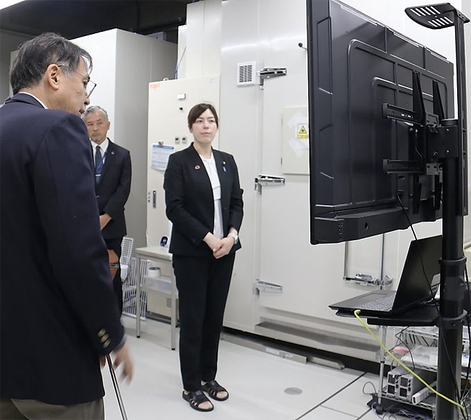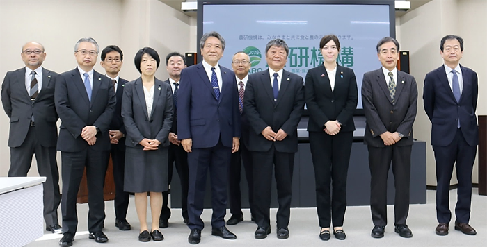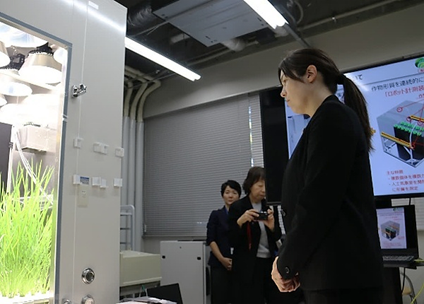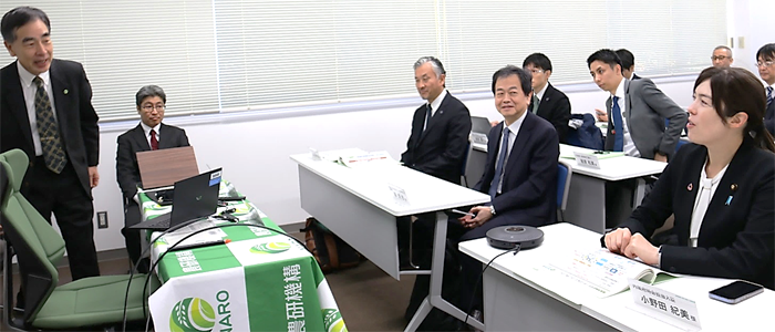 2025年11月17日(月曜日)に、小野田紀美 内閣府特命担当大臣(科学技術政策)が農研機構(つくば地区)を訪問されました。農研機構の研究開発戦略に関する説明をお聞きになったのち、農業分野でのAI活用の事例、人工気象室を活用したイネ育種加速化の実験施設をご視察になりました。農業就業者人口が急激に減少する中、農業にAIを活用する農研機構の取組を評価していただき、応援しているとのお言葉をいただきました。