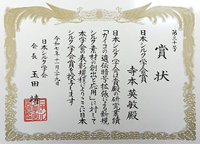 なお、日本シルク学会賞は蚕糸・絹・絹蛋白加工・絹利用に関する優れた技術・研究に対して授与される賞である。