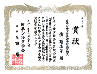 なお、若手研究奨励賞は、将来のシルク研究分野を牽引することが期待される優秀な若手研究者に授与されるものである。