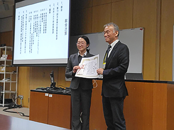 授与式の様子(左が濱 研究員、右は信州大学・玉田 シルク学会長)