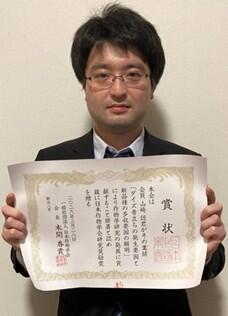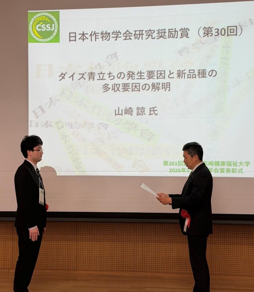 日本作物学会奨励賞は、作物学に関する研究の発展に寄与する優れた論文を発表し、さらに将来の発展を期待し得る若手研究者に授与されます。受賞者は、ダイズにおける青立ちの発生要因について、圃場栽培試験と人工気象器を用いたポット試験を組み合わせて、光環境および気温条件が青立ち発生に及ぼす影響の解明と、その対策技術の確立に資する研究を進めるとともに、多収性品種の高い生産性を支える特性についても体系的に解析し、ダイズの安定多収に資する多くの知見を提示したことなどが評価されました。