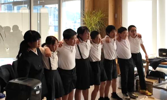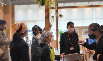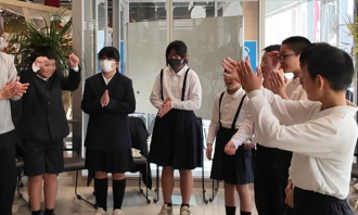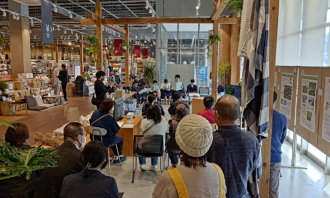 成果発表では、有機栽培の田んぼで生物多様性ランク(※)が「Sランク」だったことのほか、ひとりひとりの地域の農業や自然に対する思い、また自らが作成したキャッチコピーやイラストを発表しました。そして、発表の最後に、テーマソング「ぼくたちは伝えたい」をみんなで合唱しました。発表の後は、無印良品のスタッフの方や地域の方らと一緒に店頭に立ち、来場された多くのお客様に試食の提供やお米のPR・接客を行いました。