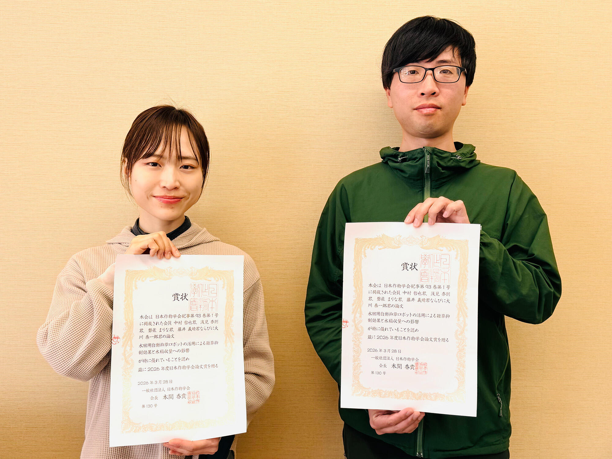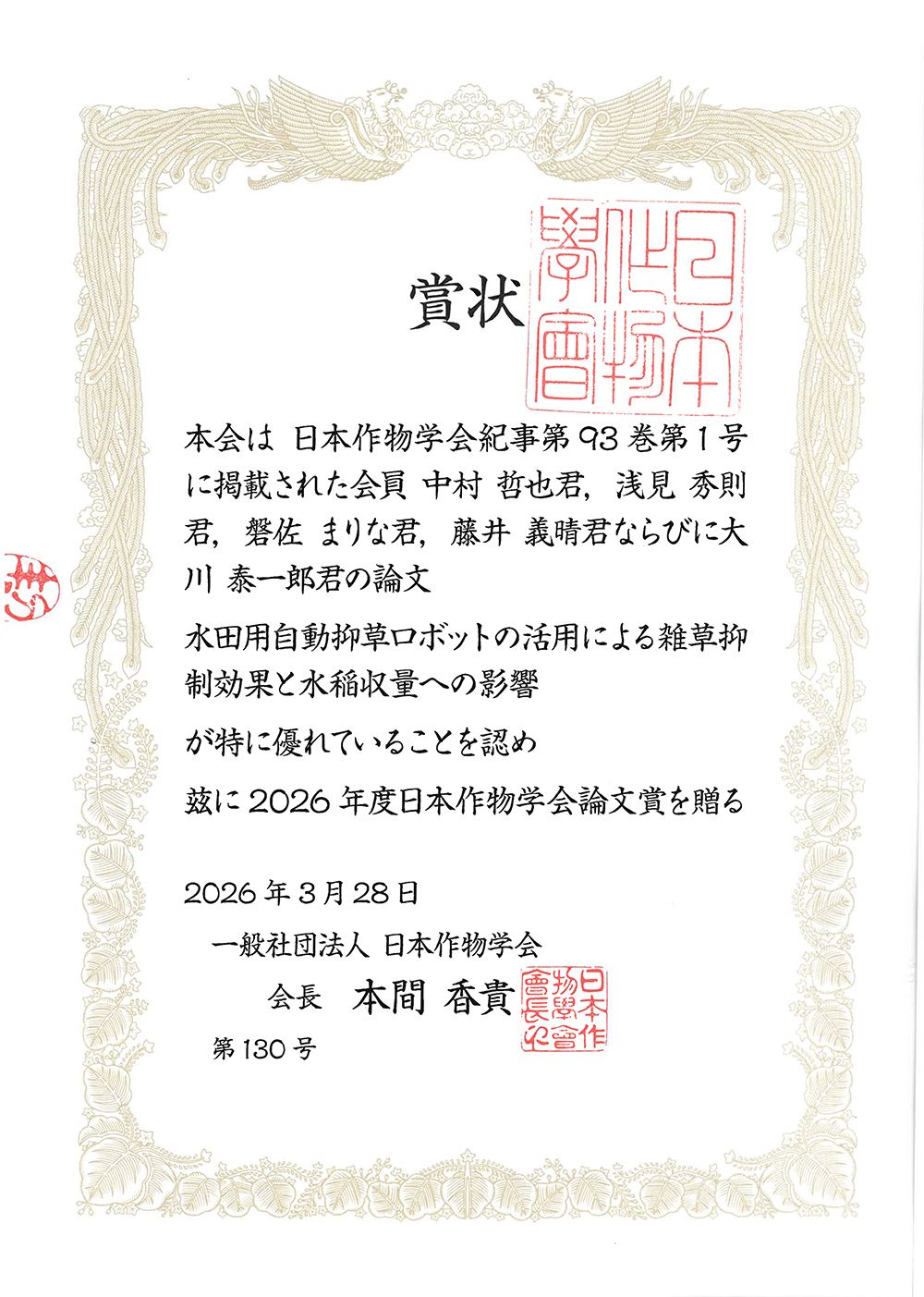 日本作物学会論文賞は、前年の日本作物学会紀事で発表された論文の中で、優れた論文の著者である会員に授与されます。受賞者らは、水田用自動抑草ロボットの抑草効果を確認する実証試験を全国36か所の有機水稲圃場で行い、ロボットの導入により雑草の発生量が水稲の収量に影響を及ぼさない程度に抑えられることを確認しました。また、ロボットの導入により、導入しない場合と比べて、収量は平均10%増加し、機械除草の回数が58%減少したことから、水稲有機栽培における省力的な雑草防除技術として水田用自動抑草ロボットの今後の活用が期待される検証結果を提示したことなどが評価されました。