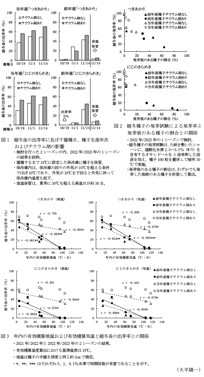 - 年内の有効積算地温および有効積算気温(いずれも基準温度10°C)が高いほど、つまり早い時期に播種するほど越冬後の出芽率は低くなる傾向にある(図3)。越冬後の出芽率を高位に保つ有効積算地温および有効積算気温は、当年産種子でそれぞれ100°C・日および110°C・日以下、前年産種子でそれぞれ20°C・日および30°C・日以下であり、これらを播種早限の目安とする。