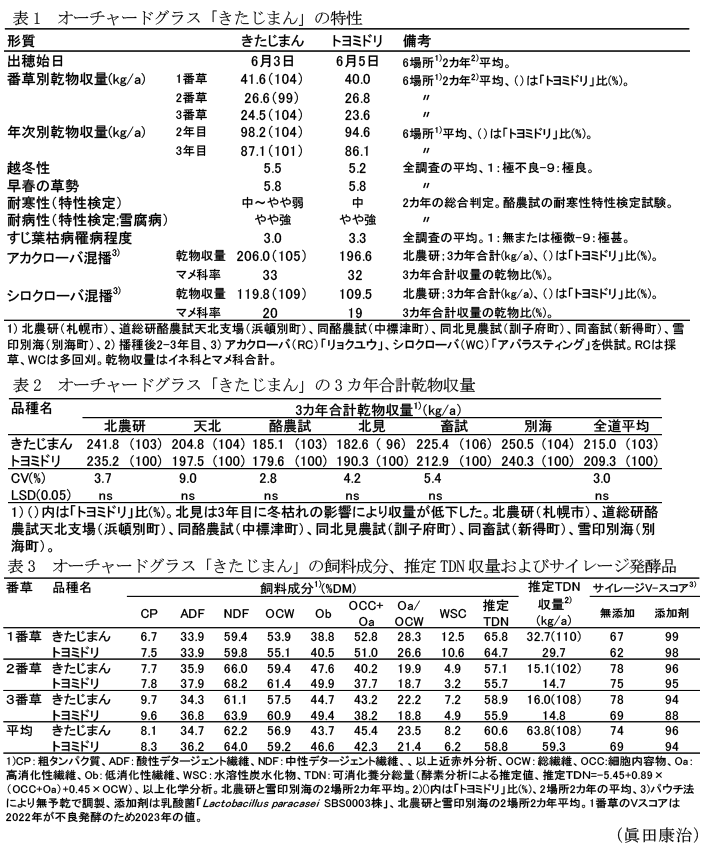 「きたじまん」は、極晩生で「トヨミドリ」に比べて水溶性炭水化物含量が2ポイント高く、高消化性成分含量が3.1ポイント高く、飼料品質が優れる。採草利用では「トヨミドリ」に比べてやや多収で、マメ科牧草との混播適性は優れる。