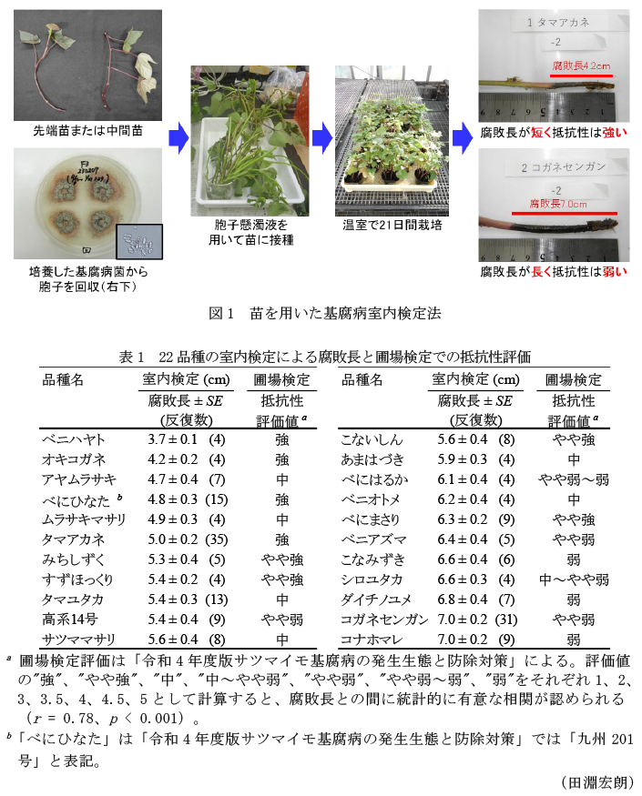 - 代表的な22品種について抵抗性を評価すると、腐敗長は抵抗性が最も強い「ベニハヤト」の3.7cmから、最も弱い「コガネセンガン」と「コナホマレ」の7.0cmの間の値を示す(表1)。室内検定の腐敗長と圃場検定の評価値の間には統計的に有意な相関が認められるため、圃場検定の評価値を一定の精度で(R2 = 0.61)推定可能である(表1)。