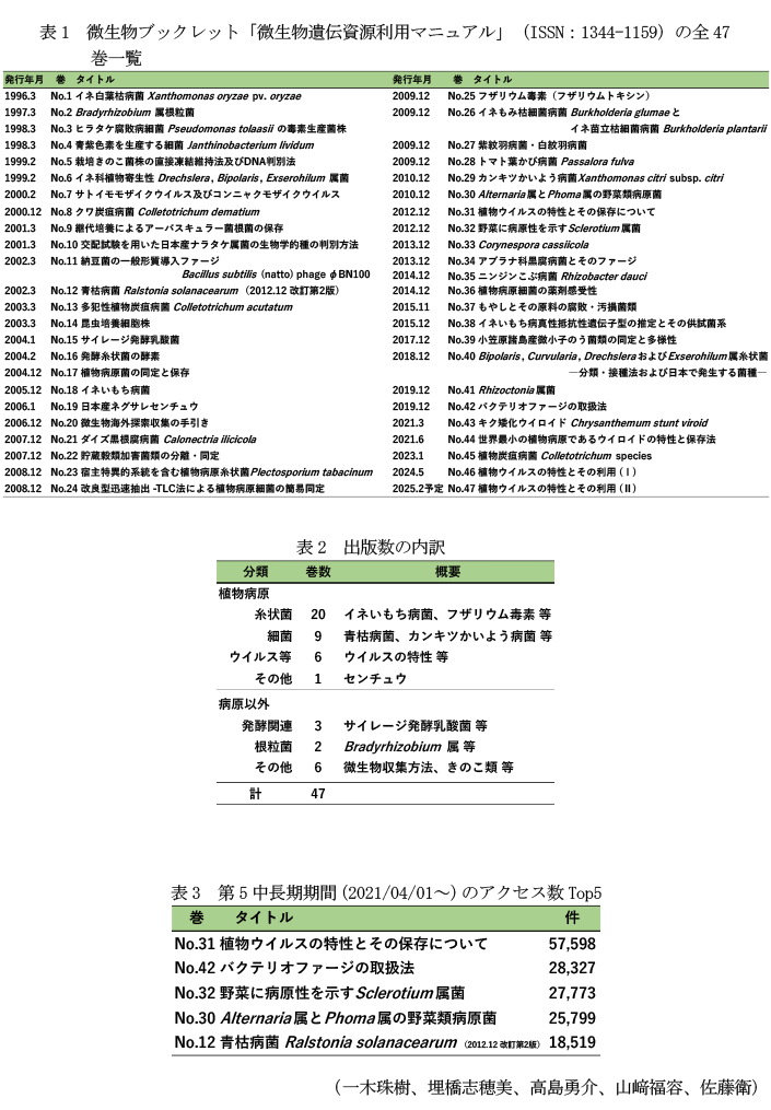 - 第5中長期期間(2021/04/01~)のアクセス数は34万件以上あり、特に31巻「植物ウイルスの特性とその保存について」、42巻「バクテリオファージの取扱法」、32巻「野菜に病原性を示すSclerotium属菌」の順にアクセス数が多く(表3)、広く利用されている。