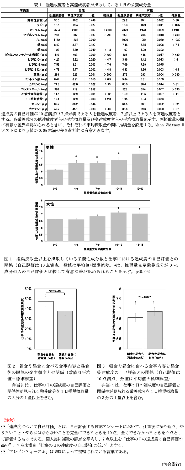 - 健常な成人男女1564名を対象とした栄養調査データを解析することで、仕事の日の達成度の自己評価が高い男性は、低い男性に比べて、表1に示す13種の栄養成分を有意に多く摂取していることが明らかとなる。また、仕事の日の達成度の自己評価が高い女性は、低い女性に比べて、表1に示す15種の栄養成分を有意に多く摂取していることが明らかとなる。これらの栄養成分の内、男女に共通する栄養成分は9種である。摂取量差からそれぞれの栄養成分の1日推奨摂取量を設定することができる。
