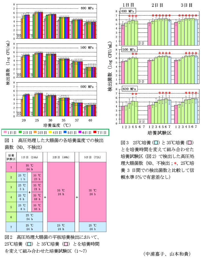 高圧処理した大腸菌の平板培養検出において、増殖に至適な35°C培養では48時間で検出できるが、検出菌数が低い問題がある。一方、25°C培養では検出菌数が最大となるが、検出に要する時間が長い問題がある。そこで、25°C培養と35°C培養とを組み合わせ、検出効率を改善する。