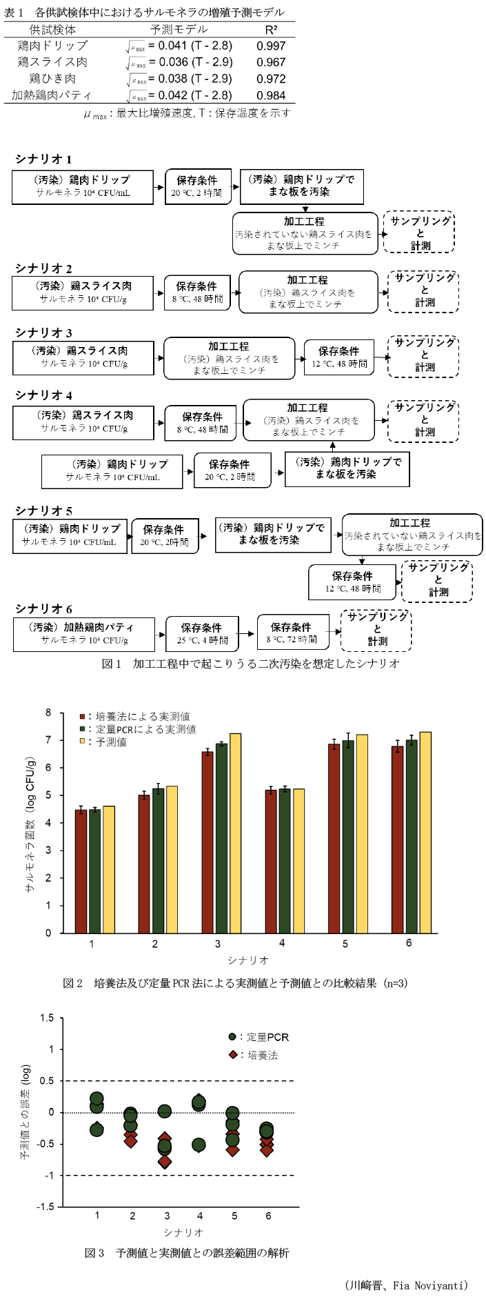 定量PCR技術を活用してサルモネラ増殖挙動データを取得することで、増殖速度に関する予測モデルが構築できる。食品の加工工程での二次汚染発生の想定シナリオにおいて、作成された予測モデルの精度は良好であり、食品加工・流通時でのサルモネラ増殖リスク推定に応用できる。