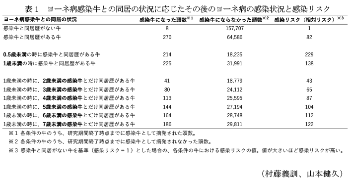 ヨーネ病感染牛との同居歴があると、ヨーネ病の感染リスクが82倍高くなる。同居時の年齢が1歳未満の場合や、同居する感染牛の年齢が高い場合、感染リスクがさらに高くなる。