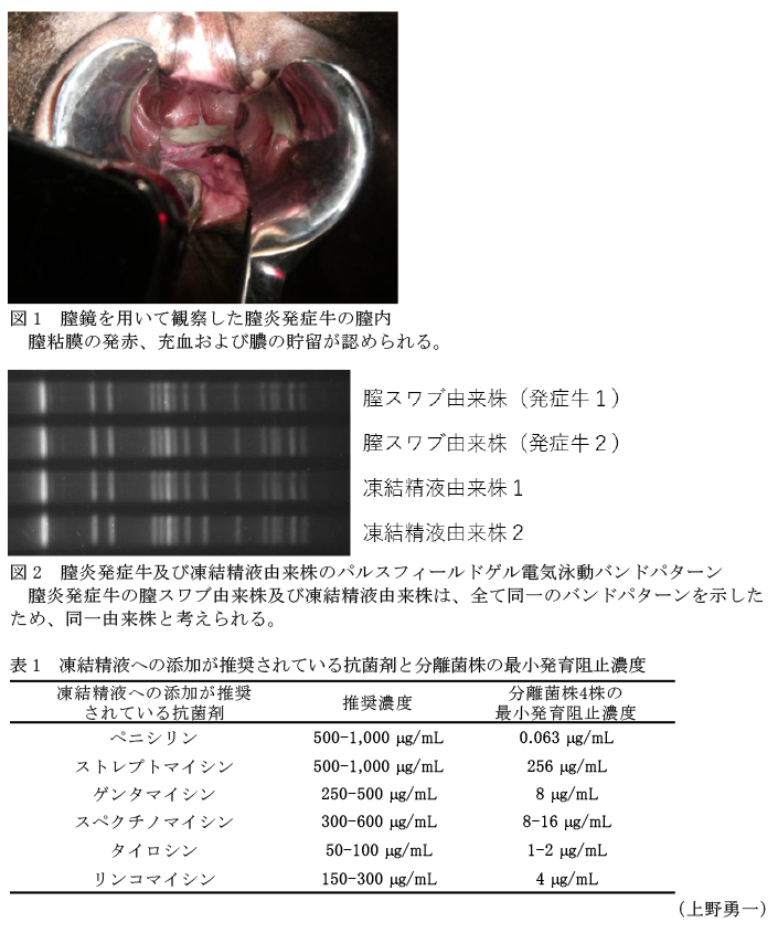 - 2020年4月、同一ロットの凍結精液を用いて人工授精を実施した牛2頭中2頭が膣炎を発症した(図1)。うち1頭は治療後も1年以上不受胎が継続した。