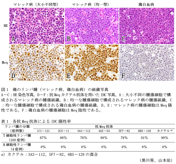 - 抗Meqモノクローナル抗体はIHCでT細胞性リンパ腫(マレック病)の腫瘍細胞に特異的に反応し、B細胞性リンパ腫(鶏白血病)の腫瘍細胞には反応しない(図1A-F)。