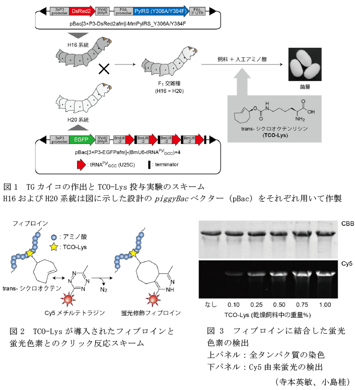 - 上記F1交雑種にTCO-Lysを飼料とともに経口投与して得られる繭層からフィブロインタンパク質を抽出・溶解し、クリック反応で蛍光色素(Cy5メチルテトラジン)を結合させる(図2)。