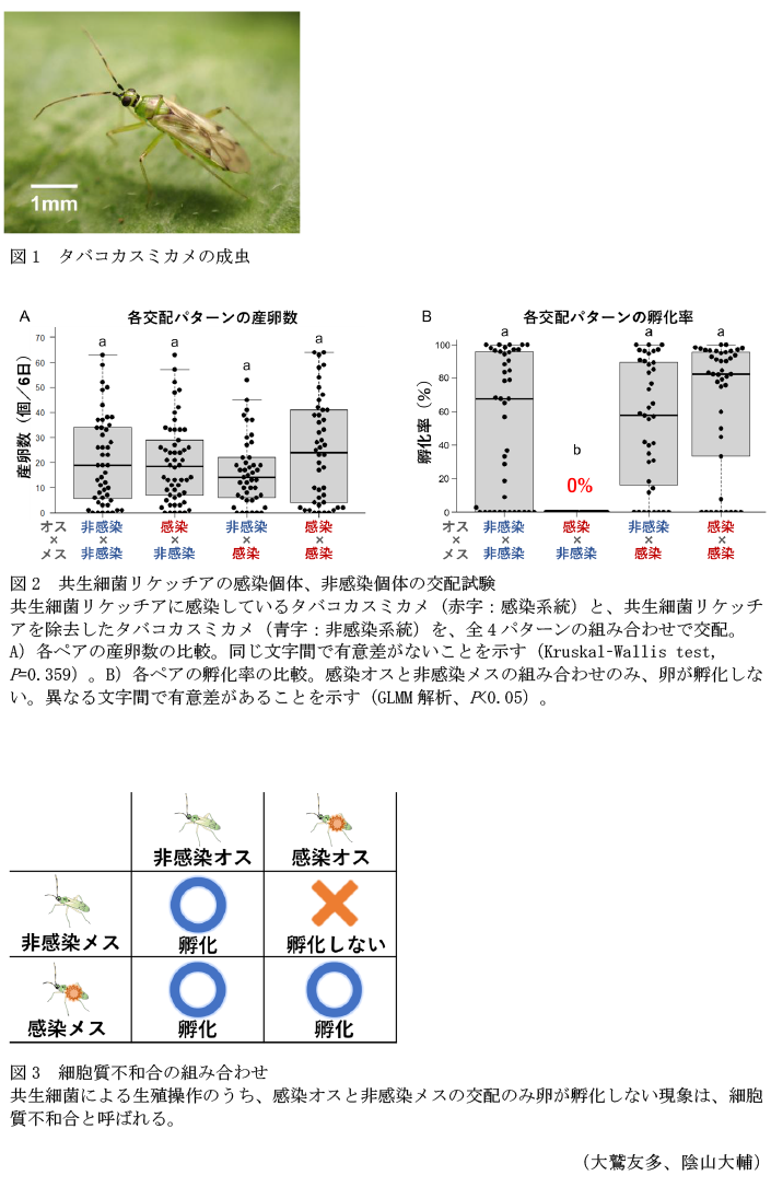 - タバコカスミカメの共生細菌リケッチアは、感染オスと非感染メスが交配した場合にのみ卵が孵化しない、細胞質不和合と呼ばれる生殖操作を引き起こす(図2)。細胞質不和合が起こる組み合わせを避けることで、タバコカスミカメの増殖効率が上昇する(図3)。