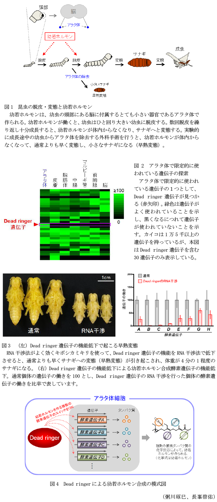 - 通常の幼虫とDead ringer遺伝子のRNA干渉を行った幼虫のアラタ体での各種遺伝子の働きを比較すると、Dead ringer遺伝子の働きを低下させた幼虫では、幼若ホルモンの合成に必要な複数の酵素遺伝子の働きが低下していることが確認される(図3右)。