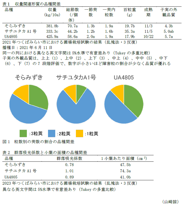 - 「そらみずき」と「UA4805」は、「そらみずき」と同等の成熟期の日本品種「サチユタカA1号」と比較して百粒重は少ないが、総節数と一莢内粒数が多いことによって多収を示す(表1)。一莢内粒数の多さは、3粒莢の割合が多く、2粒莢の割合が少ないことに起因する(図1)。