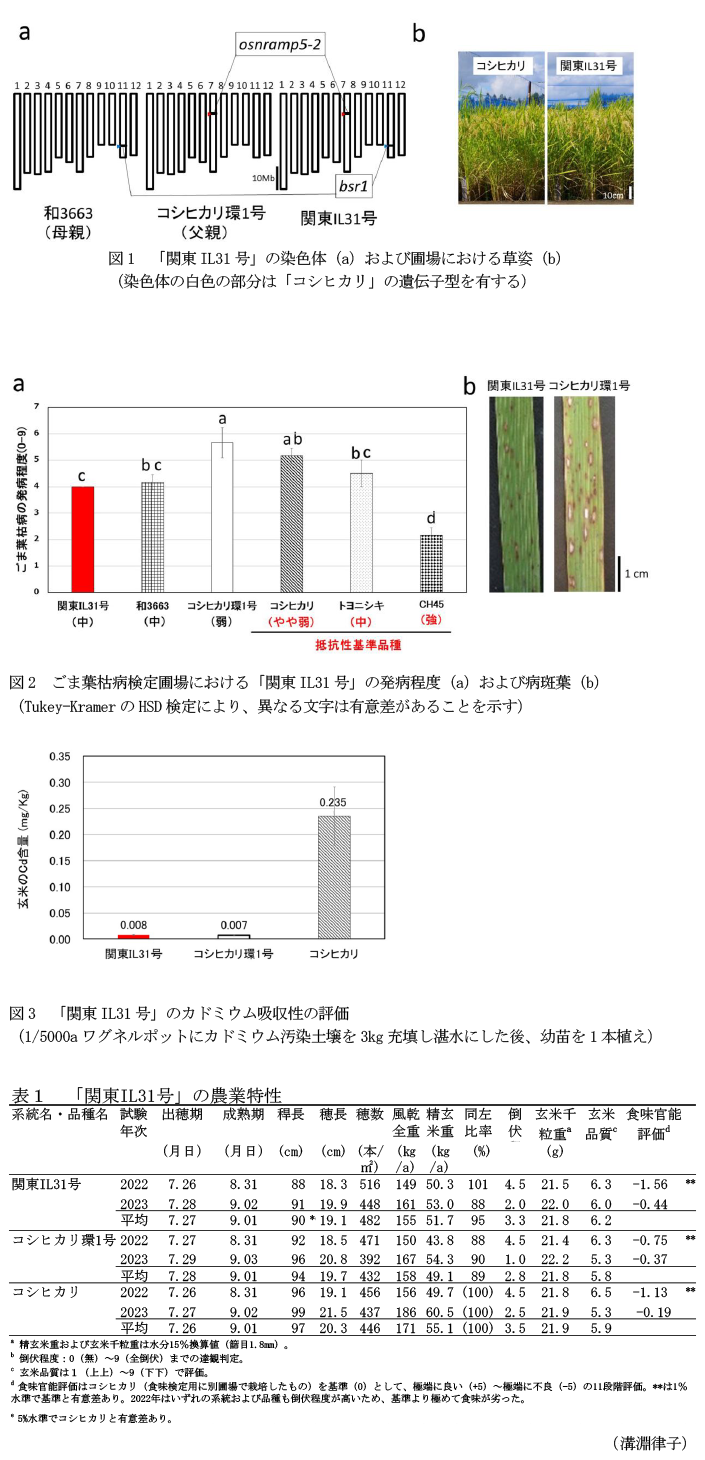 「関東IL31号」はごま葉枯病抵抗性遺伝子bsr1をカドミウム低吸収性品種「コシヒカリ環1号」に導入した系統である。「関東IL31号」はごま葉枯病抵抗性とカドミウム低吸収性を併せ持ち、出穂期、収量性、炊飯米の食味などの農業特性は「コシヒカリ」とほぼ同程度である。