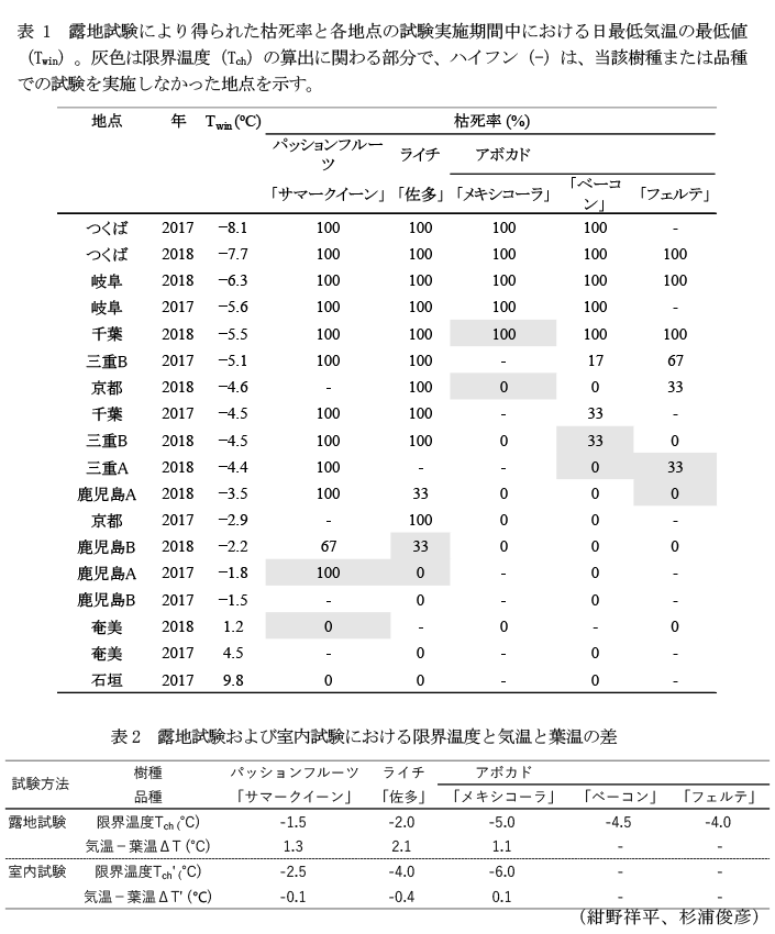 - 露地試験について、翌春に発芽しなかった樹の割合(枯死率)と試験実施期間中の最低気温 (Twin)を年別および地点別に求め(表1)、枯死率>0%の結果の中で最も高いTwinとその一つ高温側の枯死率=0%におけるTwinの平均値を限界温度(Tch)と定義すると(パッションフルーツは過去の知見も考慮)、パッションフルーツ「サマークイーン」で約-1.5°C、ライチ「佐多」で約-2°C、アボカドの「メキシコーラ」、「ベーコン」、「フェルテ」の3品種で、それぞれ約-5°C、-4.5°C、-4°Cが得られる。